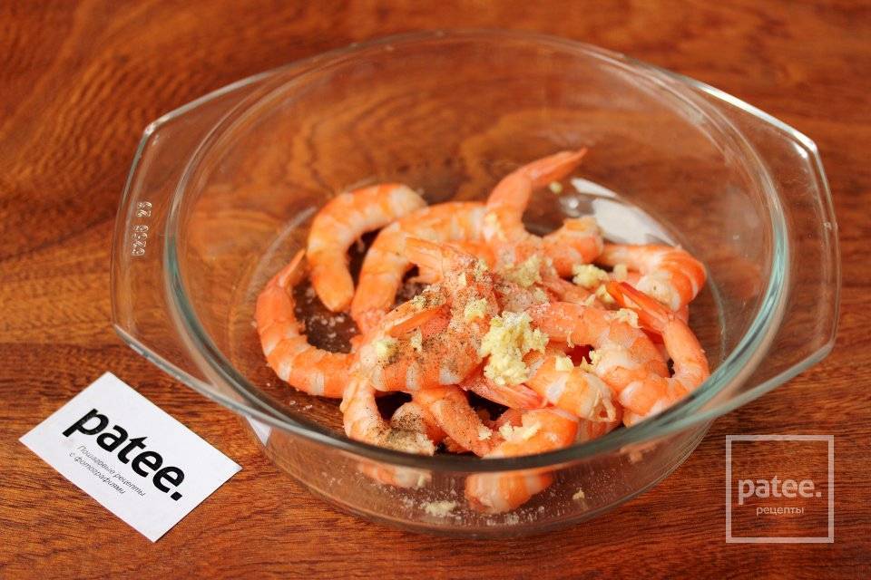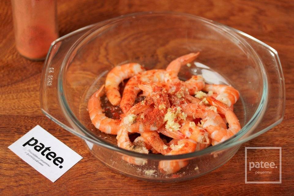 - Очистите креветки, положите их в маринад и оставьте на 10-20 минут.