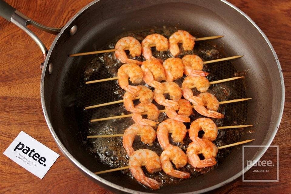 Жарим шашлычки из креветок и с этой стороны примерно минуту. Не пережарьте их!