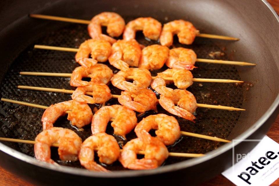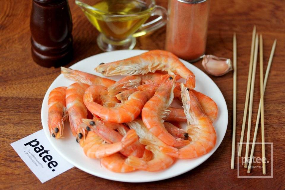 - Очистить морепродукты от панцирей, удалить прямую кишку, промыть водой. Насадить на заранее вымоченные деревянные шпажки по одной на каждую.