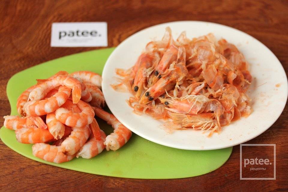 - Разморозить морепродукт, снять панцири. Острым ножом надрезать спинку и удалить полоску кишечника.
