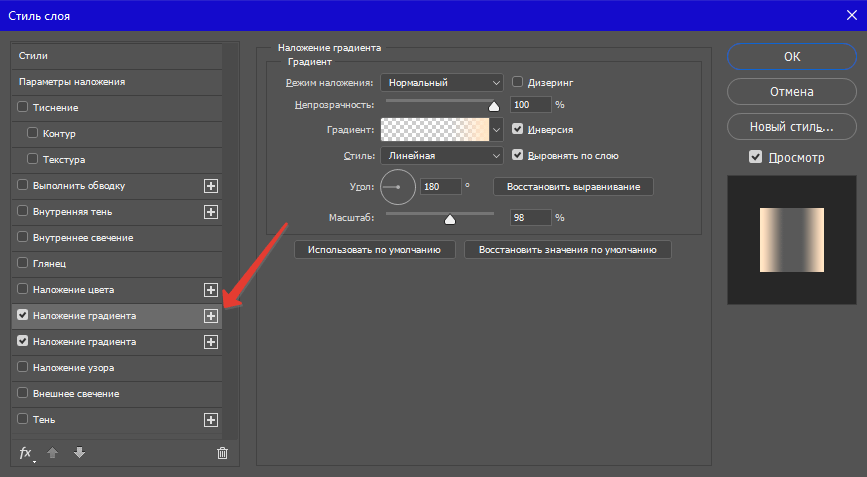 Именно так нам и нужно сделать. Чтобы градиент был по бокам, нужно выставить угол в 180 градусов.