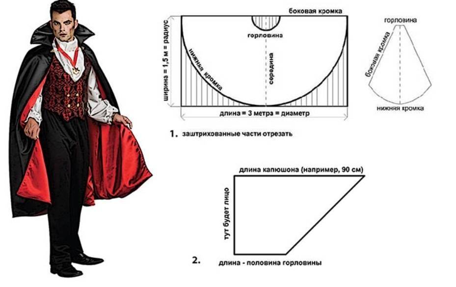 - Если же возможности где-то позаимствовать смокинг или фрак у вас нет, то в таком случае можно задрапировать себя в черный плащ с кроваво-красной шелковой подкладкой. Плащ может быть как «макси», так и «миди»; его можно сшить из бархата, тафты или других подобных тканей. На пошив плаща даже максимальной длины пойдет не больше 2 м ткани.