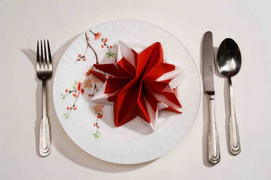 Для многих расположение сервировочных салфеток в центре тарелки является классическим. Такой прием широко используется для украшения банкетных, фуршетных столов. Умелые мастерицы с помощью простой салфетки могут создать настоящее произведение искусства. Это не так сложно, как может показаться, необходима капелька терпения и желание экспериментировать. Цветы из салфеток всегда к месту, а сделать их не составит труда. Вы можете воспользоваться известной технологией оригами, просто заменив бумагу на ткань.