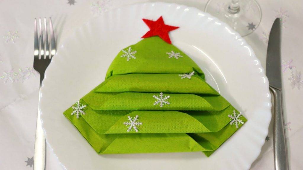 Чтобы сделать елочку для сервировки стола, возьмите салфетку глубокого зеленого оттенка. Сверните ее в квадрат, после чего разделите все пять уголков на пять слоев и поочередно загните их к середине. Переверните фигуру на противоположную сторону и симметрично загните все концы салфетки один под другой. Такое украшение будет органично смотреться в рождественские праздники.