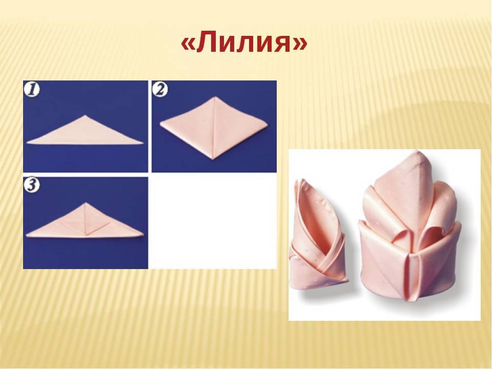 Чтобы сделать лилию, сложите изделие по диагонали и тщательно разгладьте все углы. Соедините между собой правый и левый углы с вершиной треугольника, после чего согните салфетку пополам в горизонтальном направлении. В завершении оформите лепестки и листья, вывернув вершину верхнего треугольника.