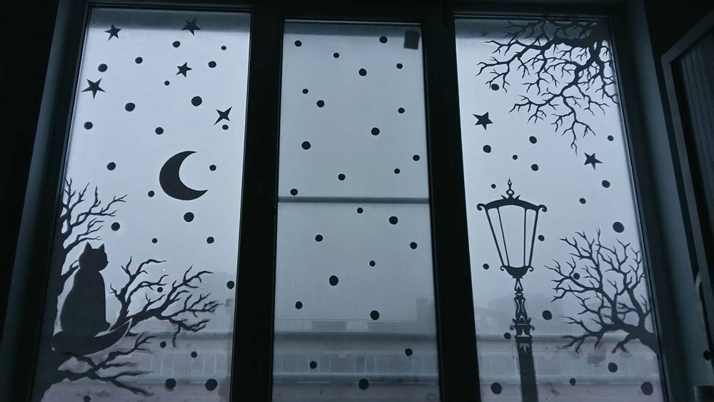 Оригинальные наклейки можно сделать собственными руками, используя клей ПВА. Днем такие украшения практически не мешают обзору, поскольку они прозрачные, словно ледяные, зато в вечернем электрическом или лунном свете становятся волшебными на вид. Причем использовать их тоже можно несколько лет подряд. Изделия из клея довольно прочны. Если их правильно хранить, они не потеряют нарядного состояния.