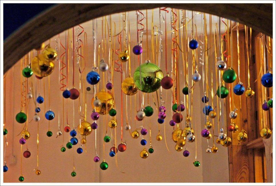 Потолки принято оформлять длинными свисающими нитями с прикреплёнными к ним звездами, лёгкими шариками, снежинками, ёлочками и даже леденцами. Оригинально смотрится потолок, полностью закрытый гелиевыми шарами благородного серебристого и голубого цвета. К концам нитей привязать фотографии коллективных мероприятий или открытки с пожеланиями. Когда через 2 дня шары снизятся, адресаты получат поздравления.