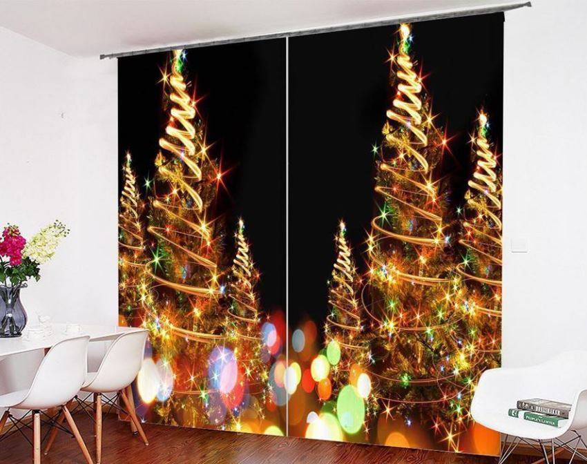 Вариант, что прослужит вам годами – шторы на новогоднюю тематику. Они подойдут для офисов, из окон которых открывается не очень привлекательная картинка. С помощью такой простой детали вы создадите иллюзию любого пейзажа.