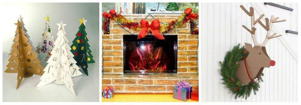 Для него подойдет одна большая коробка из-под телевизора или несколько средних, склеенных между собой. Невзрачный картон можно раскрасить гуашью наподобие кирпичиков с помощью обычной губки или покрыть самоклеящейся бумагой. Из коробок поменьше легко вырезать силуэты елочек и вставить один в другой, получив объемное деревце. А если вы всерьез решили заняться конструированием из гофрированного картона, то смастерите голову оленя, которая состоит из нескольких несложных деталей.