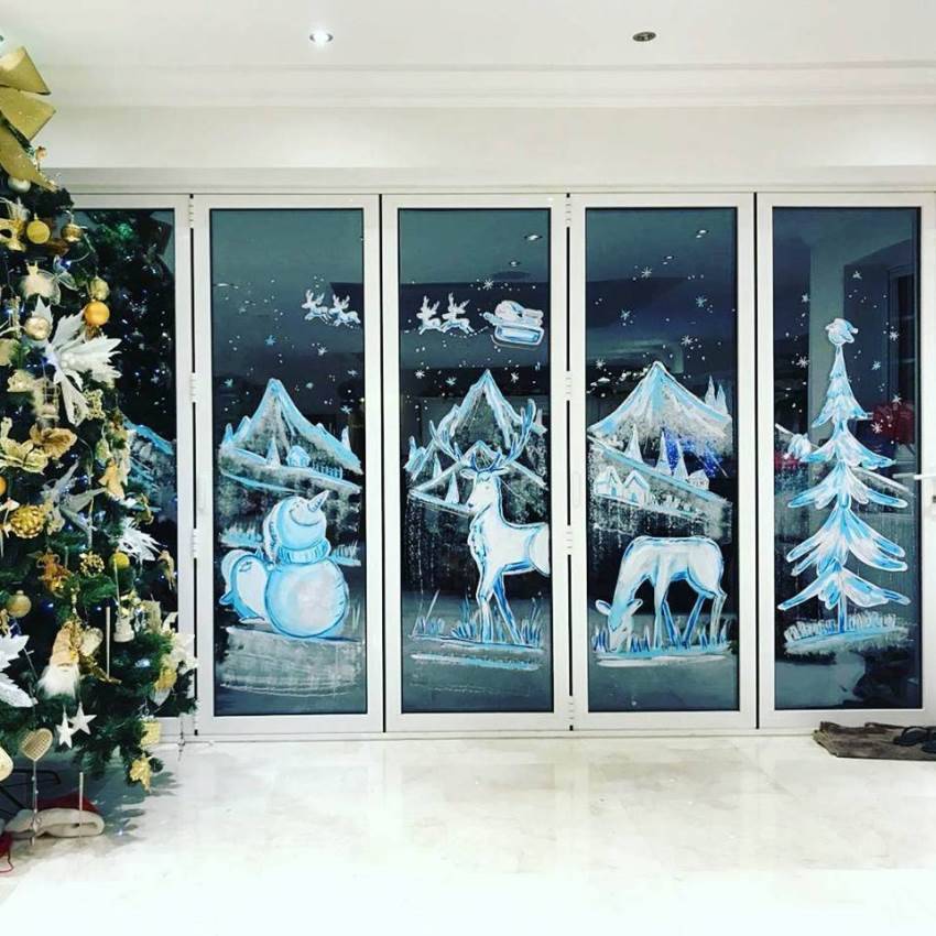 При декорировании окон можно проявить свое творчество – например, нарисовать целые композиции на зимнюю тематику. На фото – один из примеров такого сказочного украшения, выполненный из белых и голубых красок.
