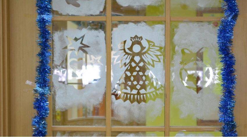 Окна и двери офисов часто украшают снежинками и вырезанными из бумаги главными персонажами праздника. Их приклеивают на мыльную основу, после Нового Года декор легко снимается с поверхности.