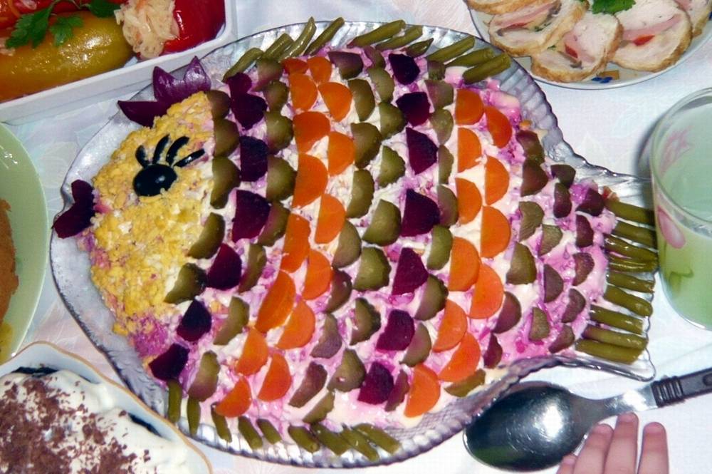 Салаты выкладывать на блюдо в фигуре ежика, жука или рыбки