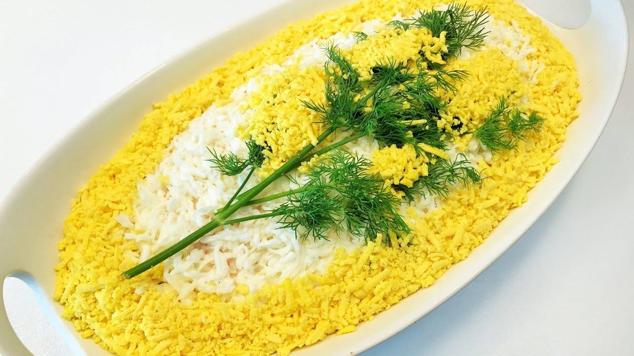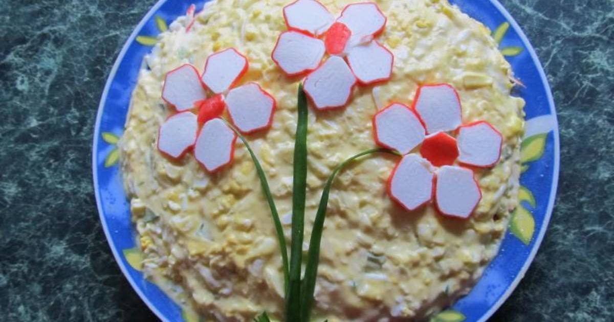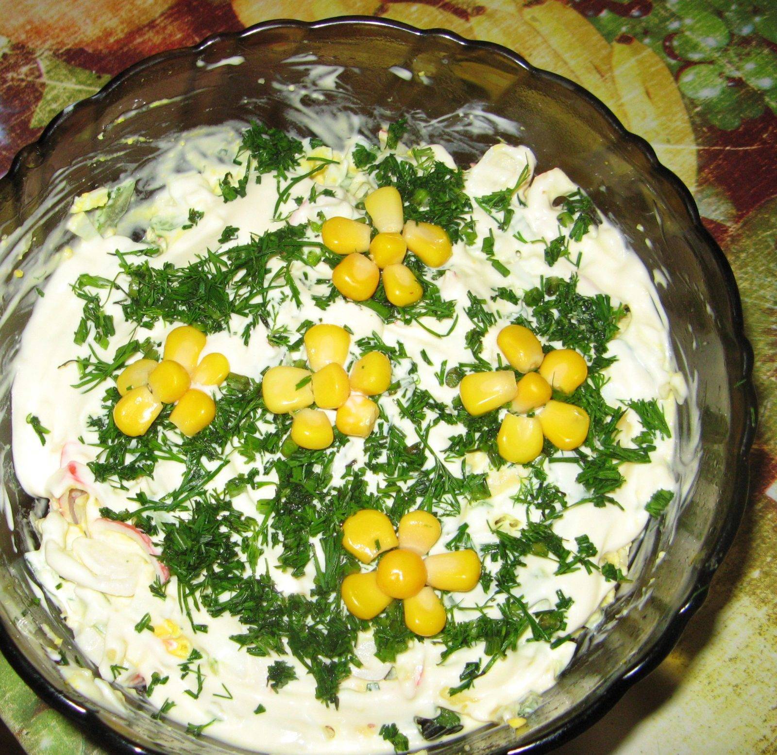 7.Натрите яичные белки на мелкую терку и выложите их на кукурузу. Все хорошо промажьте майонезом. Это был последний слой, но вы по желанию можете добавить соленые огурцы, сладкий перчик или помидорки. Или можно остановиться и на тех компонентах, которые указаны в рецепте.