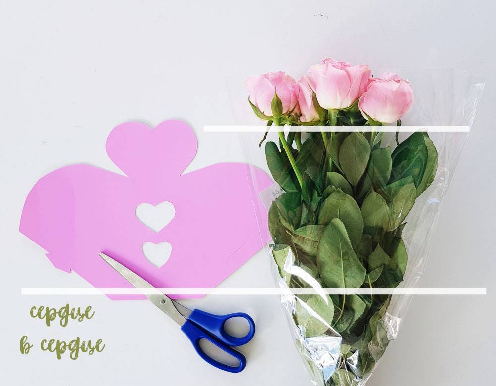 На цветной бумаге карандашом нужно нарисовать сердечко, выше которого расположить еще одно сердечко. Ну и по центру вырезать два сердца. С одного бока нужно сделать выступ, а с другого надрез. Складываем из этой заготовки конус, продев выступающую часть в прорезь. Внутрь укладываем букетик цветов, и повязываем ленту.