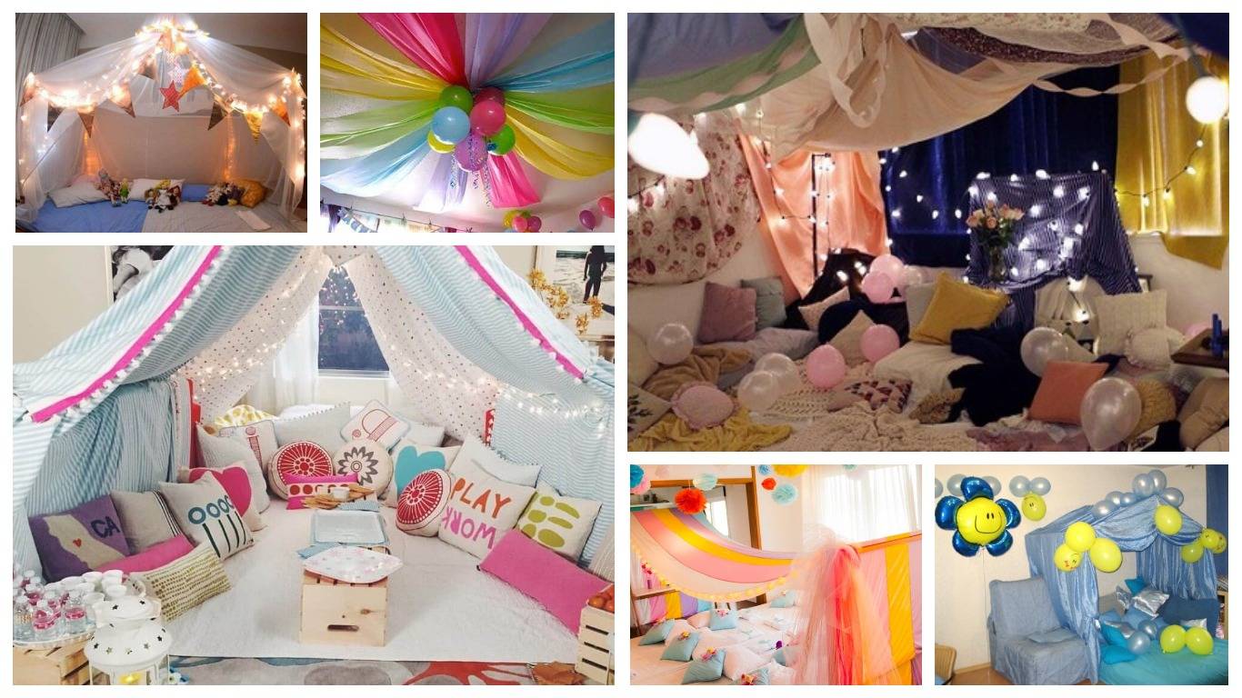 Для пижамной вечеринки можно сделать множество аксессуаров из подручных материалов своими руками. Например, палатки. Несколько штук всегда можно разместить даже в небольшом помещении. Изготовить палатку можно из простыней, пледов. Можно натянуть большую простыню от одной стены комнаты к другой, сделав своеобразный навес. Идея понравится не только детям, но и взрослым. Каждый сможет ощутить себя маленьким мальчиком или девочкой, сидящим в импровизированном шалаше.