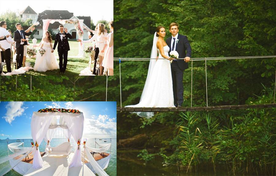 Такая свадьба может проходить где угодно: в лесу, на пляже, в старинном замке и тому подобное, лишь бы не подвела погода. Хотя как говориться: «У природы нет плохой погоды…». Любую погоду можно превратить в романтику.