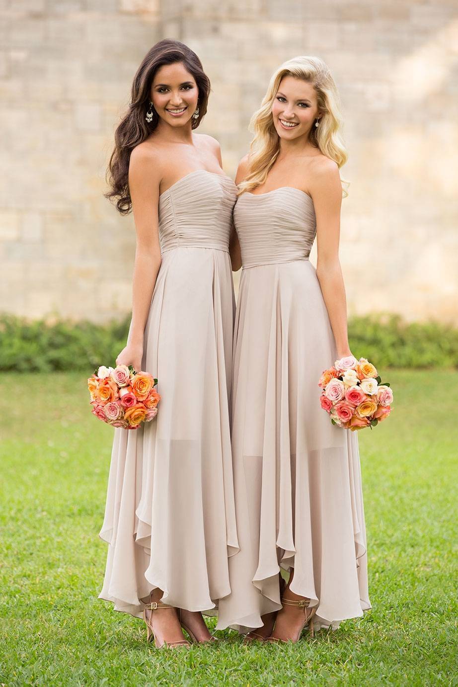Длинное платье в пол тоже допустимо, однако оно не должно быть пышным. Если ваша подруга выбрала греческий стиль своего свадебного платья, то от длинного платья для себя лучше отказаться.