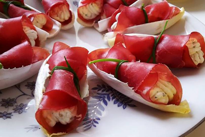 - Сверните рулетами, заверните в пленку или пергаментную бумагу и выдержите в холодильнике не менее 3 часов. Перед подачей нарежьте ломтиками и разложите на блюде.
