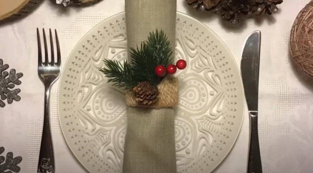 Идея заключается в применении плотных картонных или пластиковых трубок, оставшихся от использованной упаковочной пленки. Такая основа распиливается на кольца равной высоты и аккуратно, с последовательным прилеганием обматывается джутом. Затем клеевым пистолетом наносится нехитрый узор выбранной тематики и после высыхания покрывается металлической эмалью. Вариант подходит для рождественских и пасхальных застолий, отлично гармонирует со свечами, еловыми ветками, узорами серебра и позолоты.