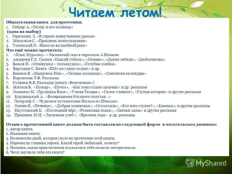 Обязательная книга для прочтения: 1. Гайдар А. «Тимур и его команда» (одна на выбор) 1. Гераскина Л. «В стране невыученных уроков» 2. Михалков С. «Праздник непослушания» 3. Успенский Э. «Вниз по волшебной реке» Что ещё можно прочитать: 1. «Илья Муромец» – былинный сказ в пересказе А.Нечаева 2. Андерсен Г.Х. Сказки «Гадкий утёнок», «Огниво», «Дикие лебеди», «Дюймовочка» 3. Бажов П. «Огневушка – поскакушка», «Голубая змейка» 4. Баруздин С. Книга «Шёл по улице солдат» и др. 5. Бианки В. «Мышонок Пик», «Лесные домишки», «Синичкин календарь» 6. Воронкова Л.Ф. Рассказы 7. Голявки В.В. Рассказы (книга «Весельчаки») 8. Житков Б. «Пожар», «Почта», «Как тонул один мальчик» и др. рассказы 9. Зощенко М. «Трусишка Вася», «Умная Тамара», «Самое главное», «Глупая история» и другие рассказы 10. Курляндский А. «Возвращение блудного попугая…» 11. Лагерлеф С. «Чудесное путешествие Нильса по Швеции» 12. Осеева В. «Печенье», «Добрая хозяюшка», «Отомстила», «Кто всех глупее?», «Ежинка», и другие рассказы 13. Паустовский К. «Последний чёрт, «Резиновая лодка», «Заячьи лапы» и другие рассказы 14. Пришвин М.М. «Лисичкин хлеб», «Времена года» и др. рассказы Отзыв о прочитанной книге должен быть составлен по следующей форме в читательском дневнике: 1. Автор книги. 2. Название книги. 3. Количество дней, которое ушло на прочтение этой книги. 4. Перечисли главных героев. Какой герой любимый, почему? 5. Напиши, какие приключения показались тебе самыми интересными. 6. Чему научила тебя эта книга? Читаем летом!
