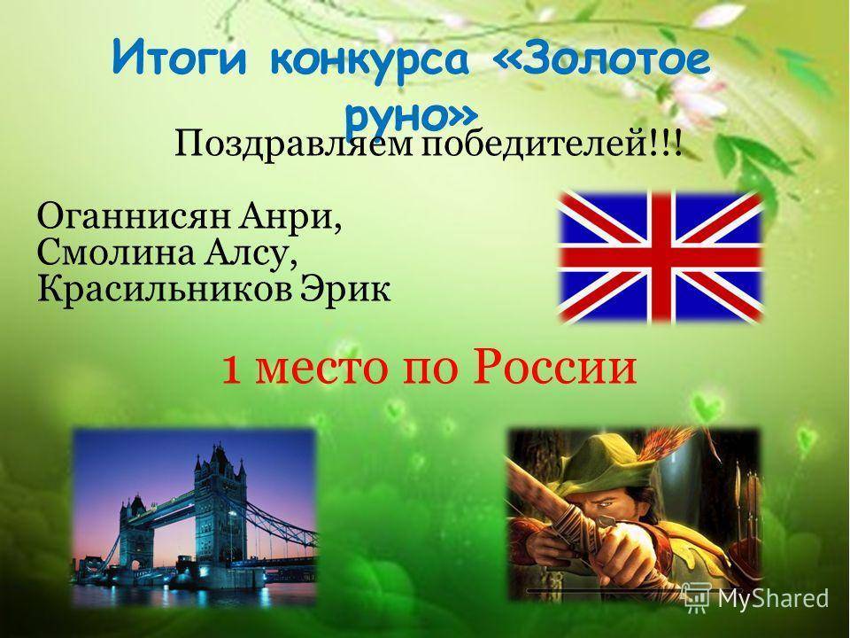 Итоги конкурса «Золотое руно» Поздравляем победителей!!! Оганнисян Анри, Смолина Алсу, Красильников Эрик 1 место по России