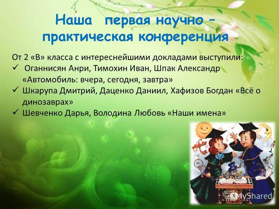 Наша первая научно – практическая конференция От 2 «В» класса с интереснейшими докладами выступили: Оганнисян Анри, Тимохин Иван, Шпак Александр «Автомобиль: вчера, сегодня, завтра» Шкарупа Дмитрий, Даценко Даниил, Хафизов Богдан «Всё о динозаврах» Шевченко Дарья, Володина Любовь «Наши имена»