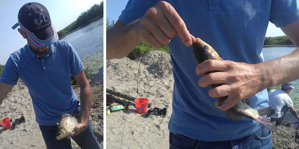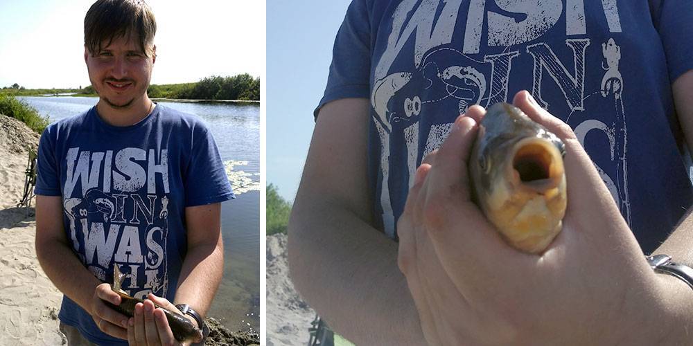 Очень жаль, но приехали мы на водоем довольно поздно. Солнце уже палило, как на лучших пляжах Таиланда. Надежды на поимку трофейного карпа таяли. В такую жару он клюет на рассвете, или вообще ночью. Зато почти сразу последовали поклевки мелочи, ее тут довольно много. Первым, как и полагается главнокомандующему, открыл счет Дима ака admin! Но тут же я сравнял счет 1:1 – опасно давать фору такому удачливому рыболову 😉 Впрочем, в итоге нам все равно стало понятно, что состязаться с ним сегодня бесполезно. Слишком сильны его ауристические способности к приманиванию рыбы… Как только Дмитрий подходил к фидерам и удочкам, на них почему-то сразу начинало клевать!