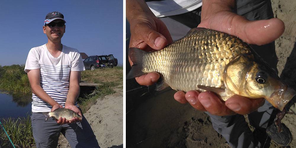 Очень жаль, но приехали мы на водоем довольно поздно. Солнце уже палило, как на лучших пляжах Таиланда. Надежды на поимку трофейного карпа таяли. В такую жару он клюет на рассвете, или вообще ночью. Зато почти сразу последовали поклевки мелочи, ее тут довольно много. Первым, как и полагается главнокомандующему, открыл счет Дима ака admin! Но тут же я сравнял счет 1:1 – опасно давать фору такому удачливому рыболову 😉 Впрочем, в итоге нам все равно стало понятно, что состязаться с ним сегодня бесполезно. Слишком сильны его ауристические способности к приманиванию рыбы… Как только Дмитрий подходил к фидерам и удочкам, на них почему-то сразу начинало клевать!