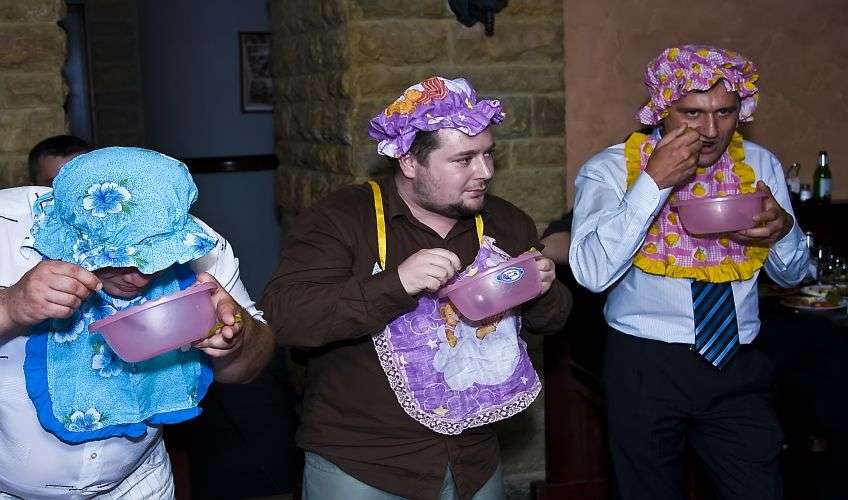 Самый типичный и весёлый вид конкурсов. С его помощью создаются новые образы. Вы ни в какой другой ситуации не увидите мужа на каблуках, с помадой и в юбке! Люди раскрываются с неизвестных доселе сторон и забавляют всех окружающих.