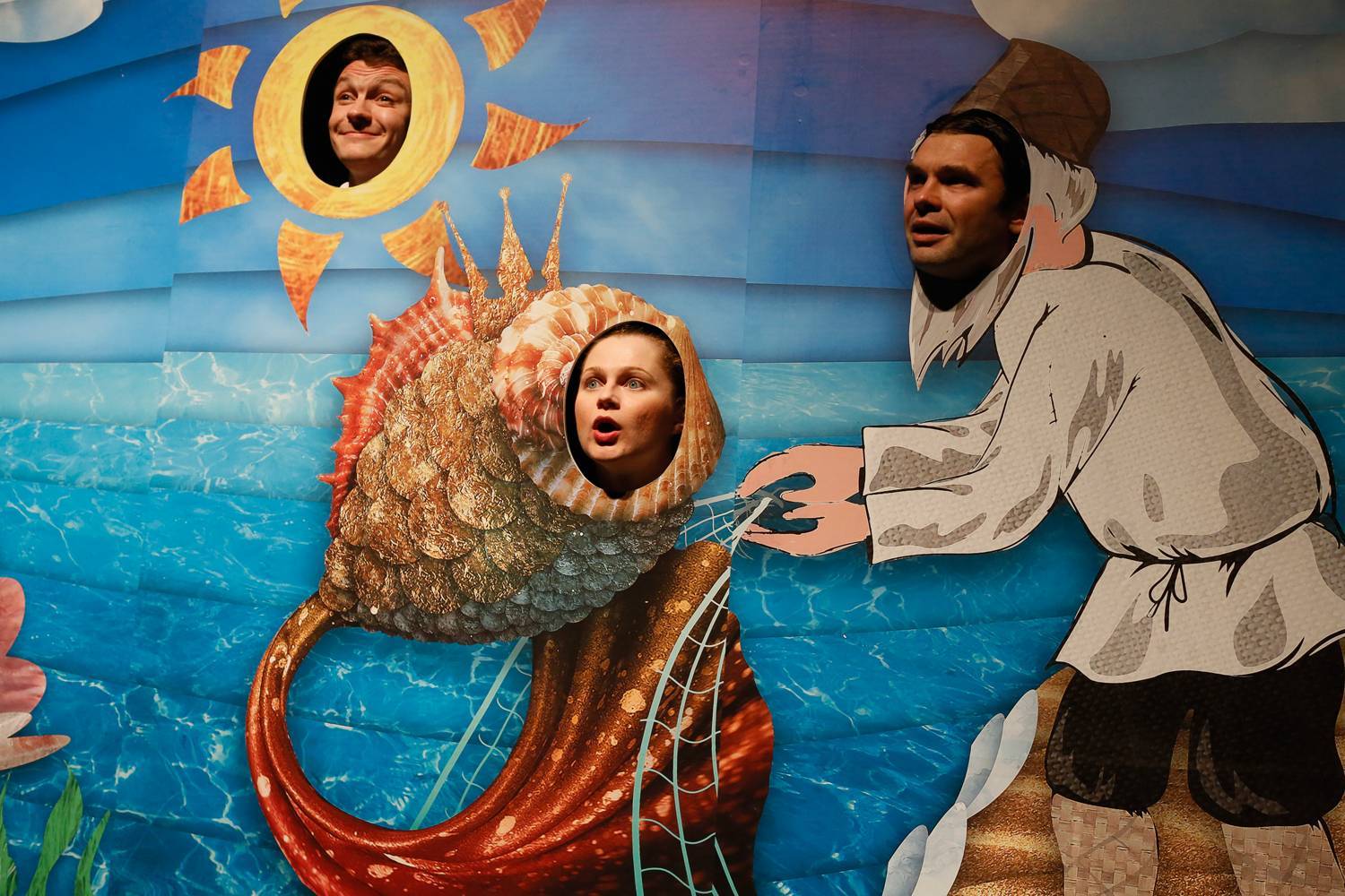 Сцена: Сказка о золотой рыбке. Действие происходит близ расположившейся публики с участием гостей мероприятия. Ведущий заранее определяется роли: