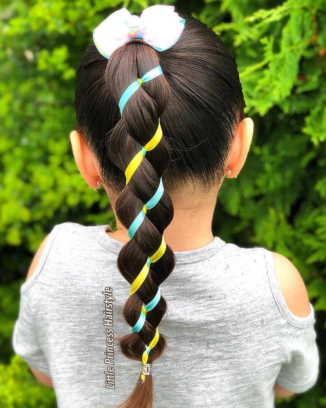 - Забавный хвостик — сделайте высокий хвост, отделите несколько прядей и сплетите из них тоненькие косички, которые закрепите маленькими цветными резинками.