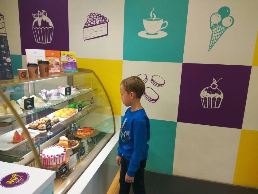 “Постояв минуты две и поразглядывав вывеску, мы попадаем в наполненное светом, безумно яркое и насыщенное цветом, в желто-фиолетово-бирюзовой цветовой гамме, красивое помещение. Там нас встречает приветливый продавец десертов,а также две больших витрины с разнообразными лакомствами на любой вкус…Глаза разбегаются…Так все красиво и аппетитно…”