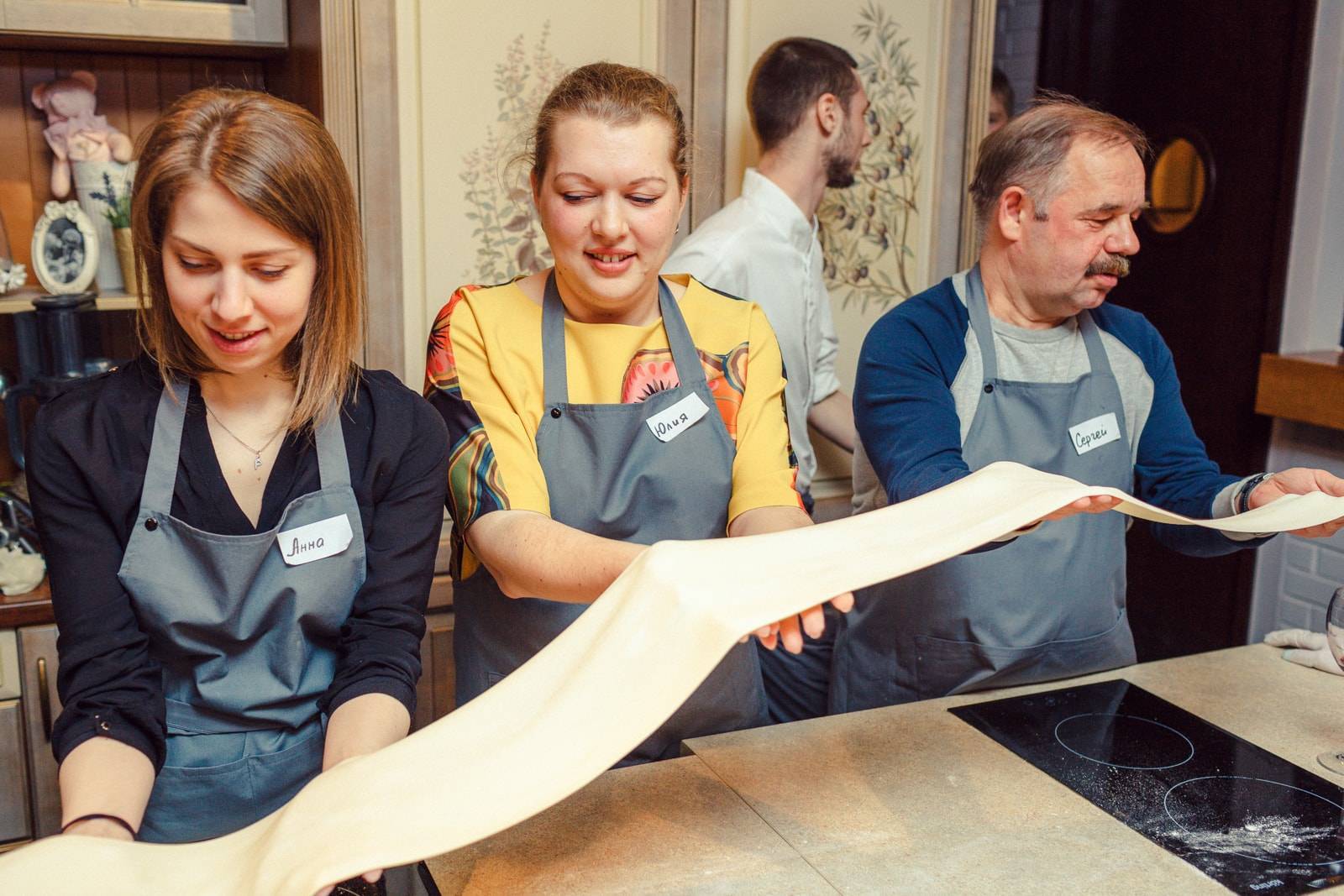 - Разделившись на команды, участники кулинарного тимбилдинга готовят три блюда, которые потом войдут в меню общего праздничного ужина.