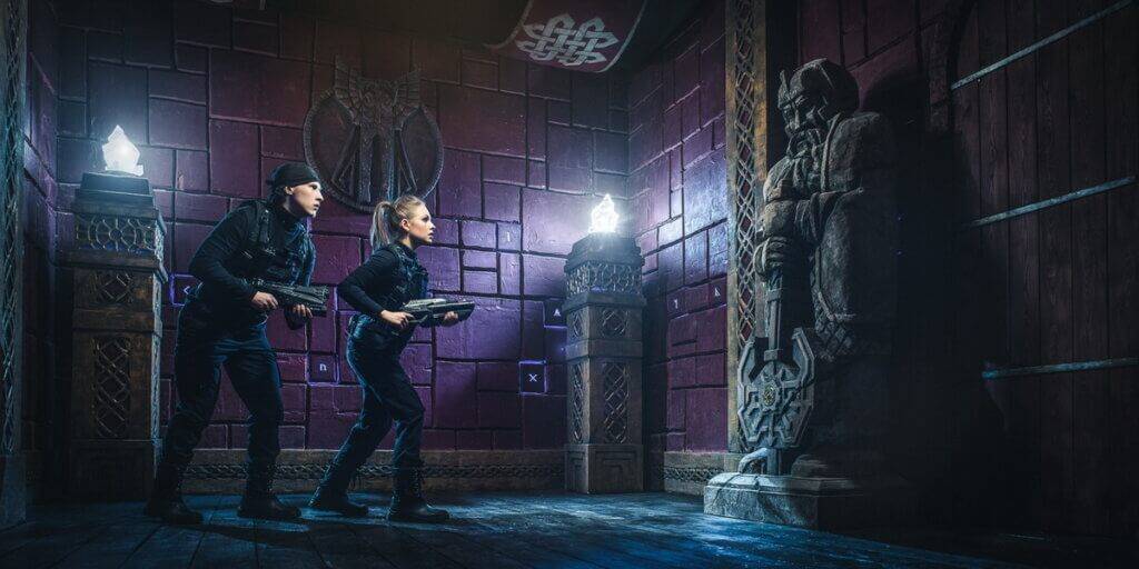 VR — виртуальная реальность. Игра прохрдит в лазерном лабиринте с применением очков виртуальной реальности.