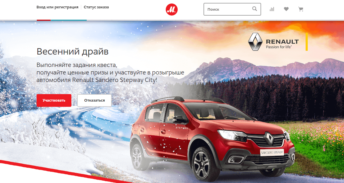 В отличие от Тинькофф-банка, пример которого я приводила выше, участники квеста от М-Видео не совершали покупки больше чем на 2990 рублей, но при этом могли выиграть потрясную машину Рено Сандеро. А точнее получить сертификат на приобретение авто.