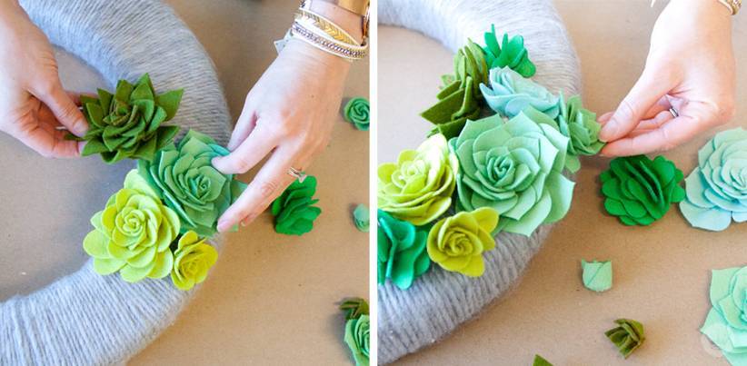 Полученными в результате цветами разной формы и размера можно декорировать венок на стену, рамку для фотографии, мягкую мебель и другие изделия из текстиля.