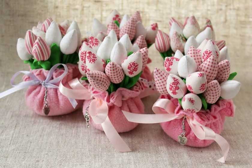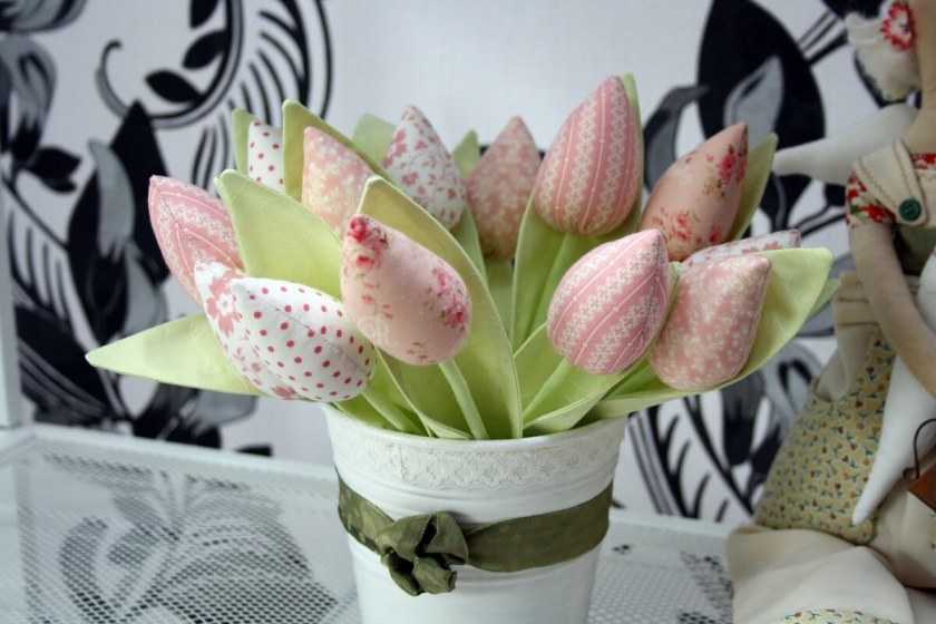 И последний мини мастер-класс: изготовление текстильного тюльпана. Такие тюльпаны любят группироваться, семь и более штук – это шикарный букет, который украсит собственный интерьер, а в качестве подарка будет просто шикарен. Над таким творением придется потрудиться, особых швейных навыков не потребуется, только элементарное владение иглой и ниткой. Для бутона понадобится три одинаковых заготовки миндалевидной формы с усеченным основанием с одной стороны. Ткань может быть как однотонной, так и в горошек, мелкую клеточку, цветочек. Для стебля – полоска ткани зеленого цвета размеров 20 см на 4 см. Также нужна заготовка листа тюльпана немного меньше по длине, чем ножка. В основание стебля будущего тюльпана можно вставить трубочку от коктейля, деревянную палочку или проволоку. Ниже прилагается фото, как сделать цветок из ткани, чтобы визуально представить этот процесс.