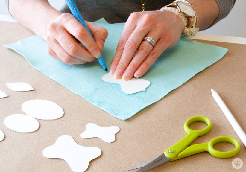 Шаг 2. Выкройки приколоть к фетру каждую к своему цвету и вырезать нужное количество деталей.