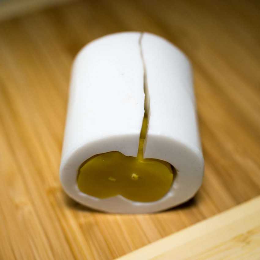 Сначала на деревянной дощечке из воска нужно вырезать трапецию. Дальше, на край фигуры, который шире, необходимо вдавить шнур – фитиль, затем плотно скрутить воск, предавая ему форму конуса и обрезать лишнюю нить у основания. Основа свечки готова!