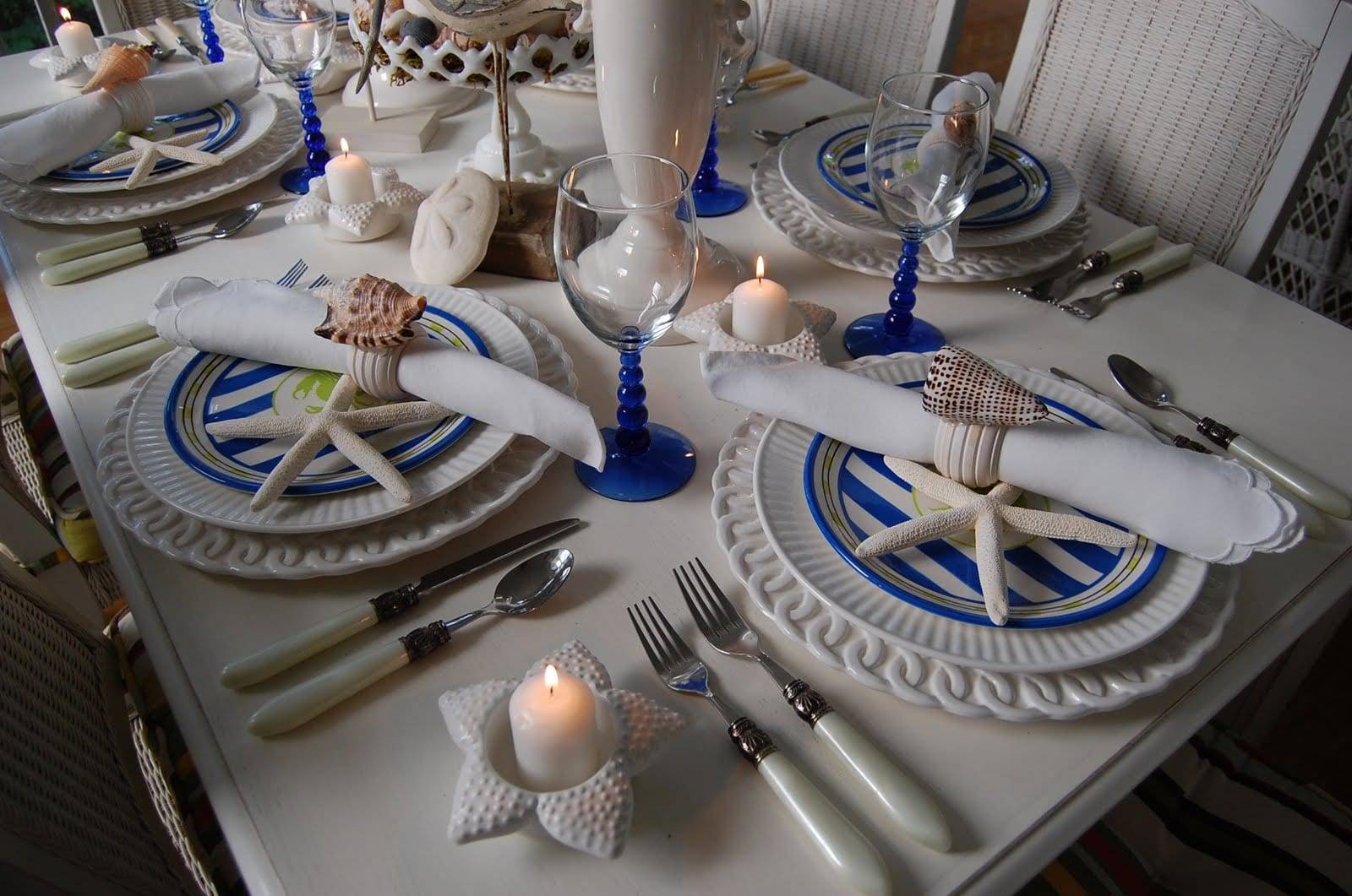 По столу, вдоль центра, можно разложить слегка перекрученный «невод» – точнее, узкую сеть из синтетического белого волокна. Необходимый настрой помогут создать пёстрые ракушки, раковины-розетки перламутрового окраса, морские звёзды. Приветствуется использование стеклянных сосудов для установки свечей, 1/3 этих сосудов наполняют смесью ракушек и песка. Небольшие ракушки используют, чтобы подавать соль, перец, сахар и специи. Салфетки можно брать только из белой льняной материи.