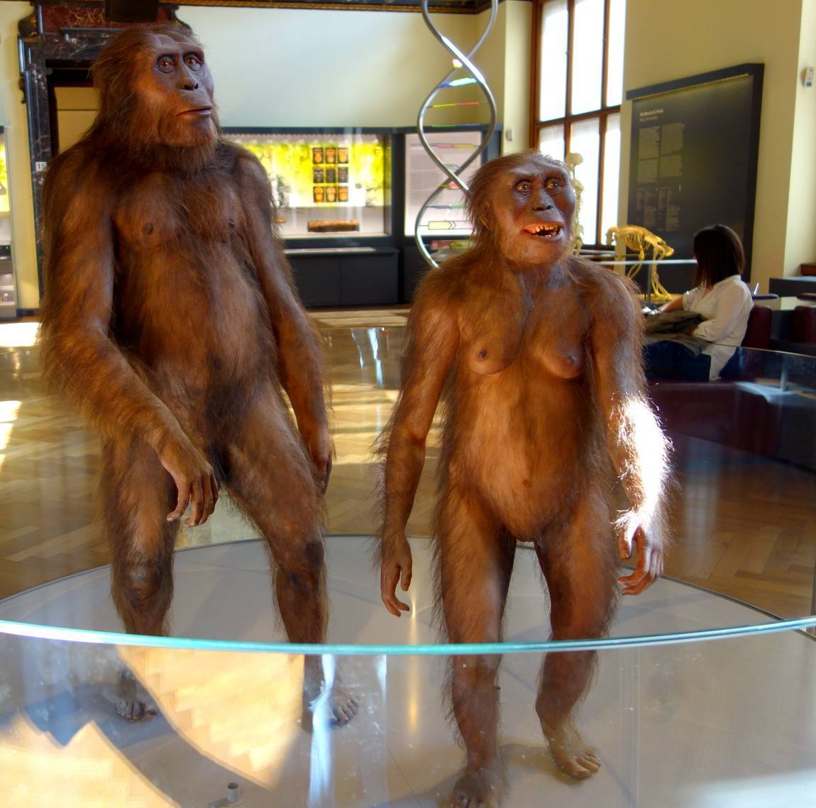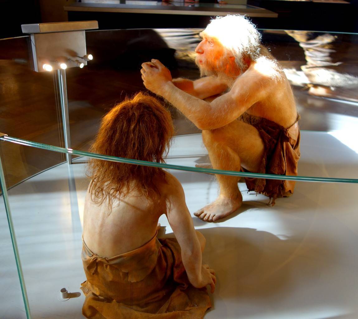 В стеклянных витринах округлых форм представлены доисторические люди реалистично выполняющие простые движения.
