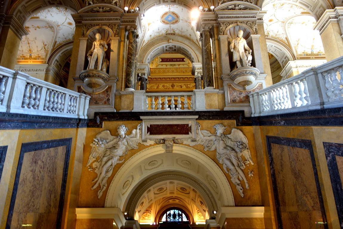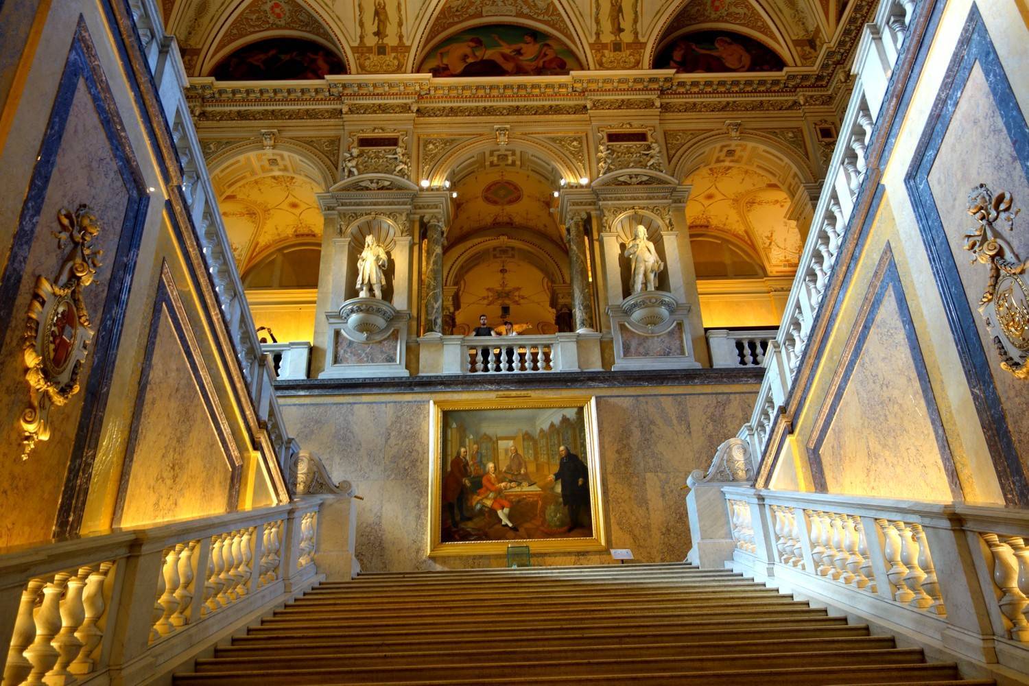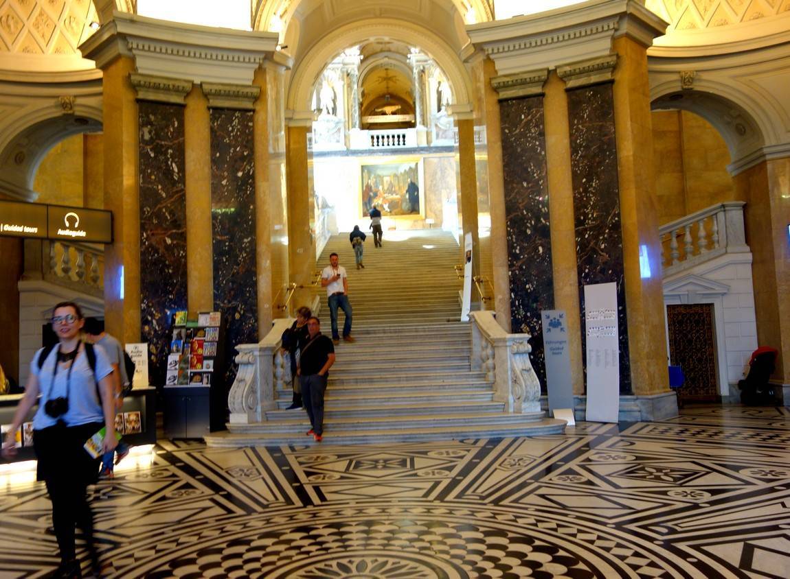 В парке люди отдыхают прямо на травке. А мы направляемся по ступеням в музей. Билеты стоят по 10 евро на человека. Экспозиции расположены на трёх этажах в 39 залах. Чтобы осмотреть их нужно не менее двух часов, у нас чуть более часа. Самыми первыми коллекциями музея были экспонаты приобретённые Габсбургами.