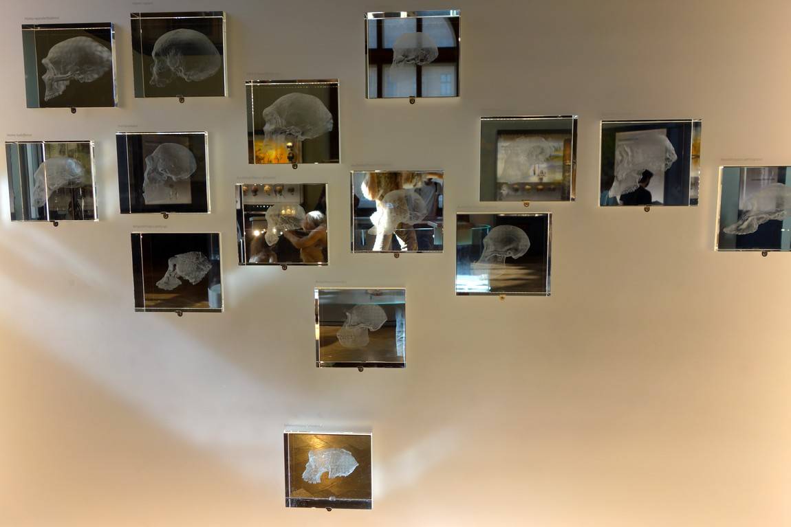Снова спускаемся ниже, и смотрим микромир через микроскопы. Далее на стенде показаны формы черепа выполненные лазером внутри стекла. А также естественный череп «с цветочками».