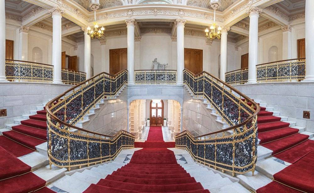 Гостей встречает удивительная по красоте парадная мраморная лестница.