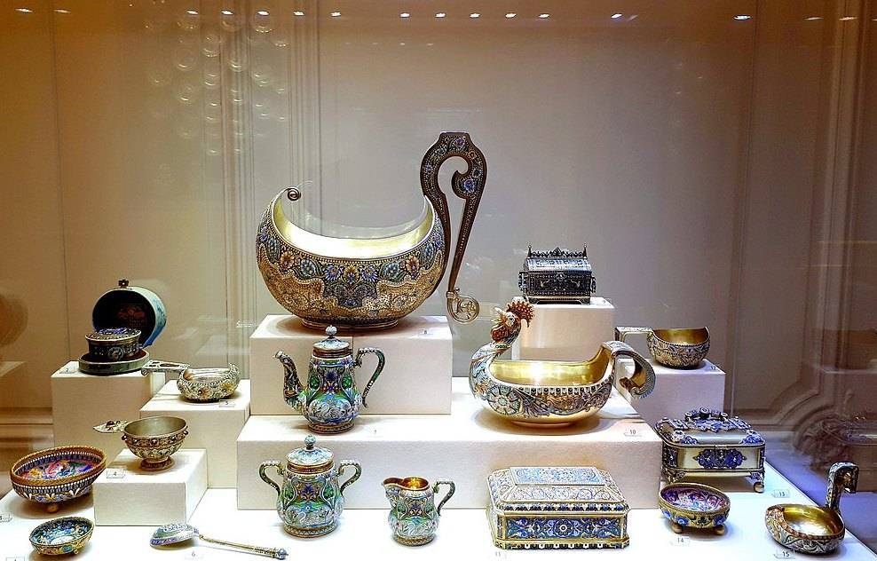 К примеру, в Терракотовом зале можно увидеть различную утварь из фарфора, серебра. Также запомнились произведения искусства, выполненные редкой ювелирной техникой эмаль-гильоше, когда орнамент расчерчивается в виде линий, волнистых и переплетающихся. Сочетание гильошированной поверхности с эмалью придает изделию неповторимую выразительность и обеспечивает долговечность.
