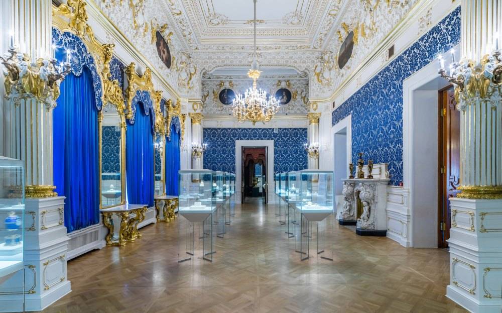 - Белая и Голубая гостиные, в которых представлены эмалированные изделия ювелирной фирмы Павла Овчинникова, а также русский фарфор XIX века.