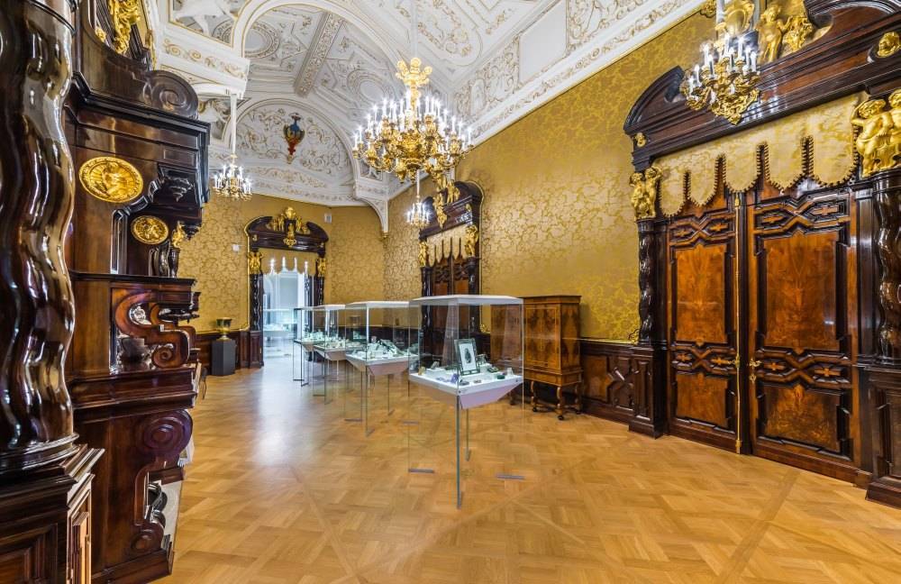 - Золотая гостиная – хранилище императорских подарков: сувениры от фирмы Фаберже, золотые табакерки с государственной символикой и портреты русских императоров