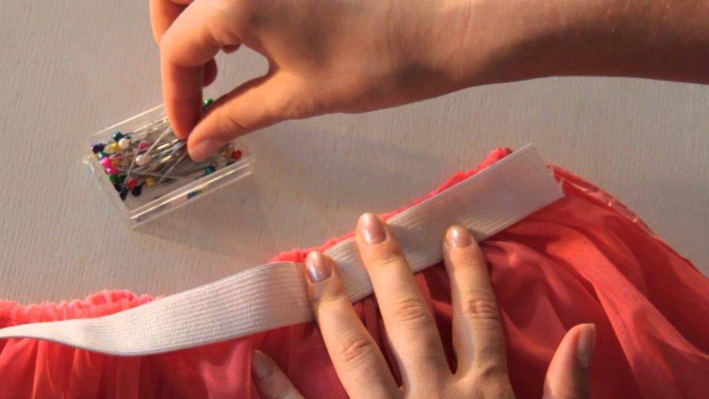 Возьми широкую резинку и отрежь кусок на 3 см меньше обхвата талии, а потом сшей края вместе. Если сразу взять декоративную резинку – можешь переходить к соединению частей. Сначала сметай фатиновую юбку с атласной подкладкой, а уже потом пришивай резинку, аккуратно ее растягивая.