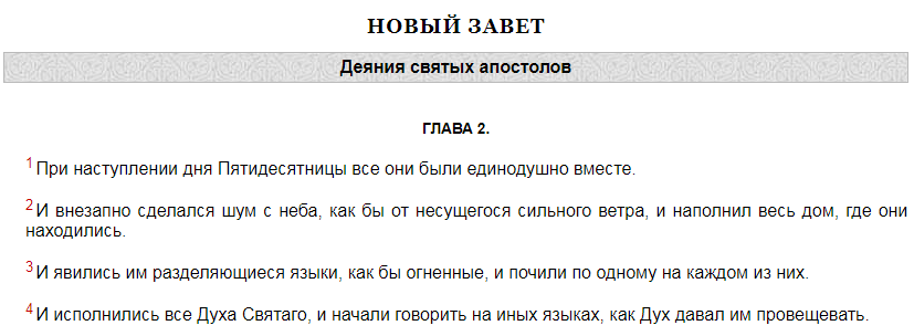 Этот невещественный огонь был зрительным образом Святого Духа. Преисполненные Им, апостолы переродились к новой жизни. Отныне их ум отверзся для постижения тайн Царствия Небесного. Но, кроме того, Благодатью Божией им были дарованы силы и способности, необходимые для проповеди истинного учения среди самых различных народов. Их уста отныне вещали на языках, прежде чуждых и не известных им. Подобное чудо привело в смятение свидетелей их первых проповедей. С величайшим изумлением иноплеменники узнавали в их речах звуки родного языка.