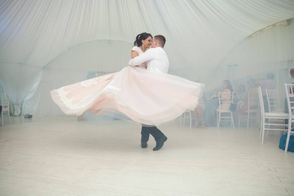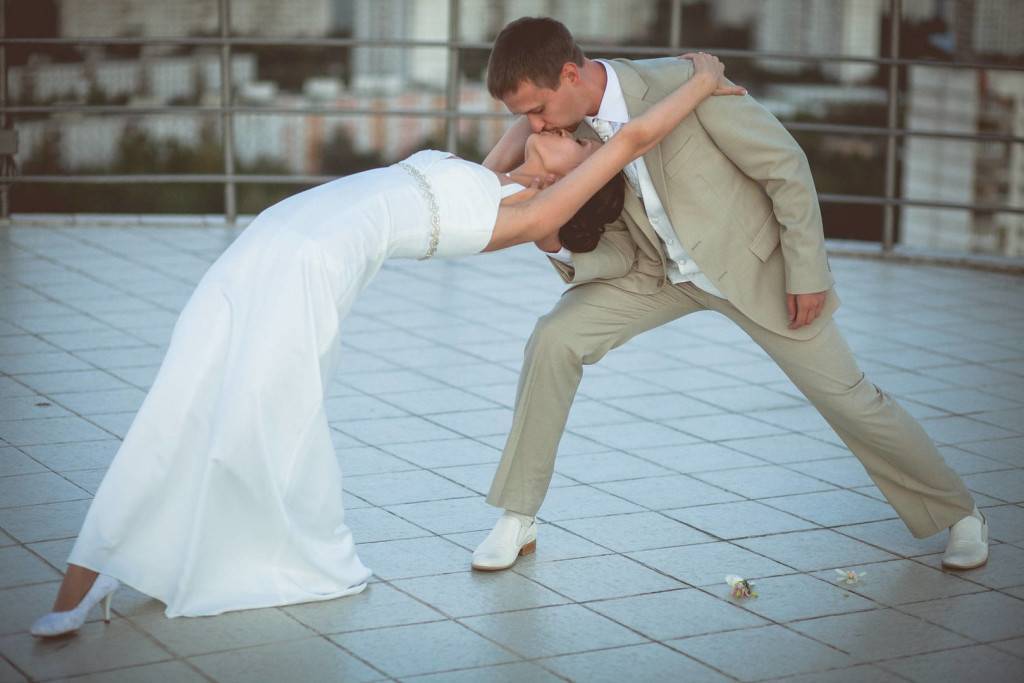 Страстно, но совсем не вульгарно – свадебная поза для фотосессии с поцелуем, пока жених кружит невесту на руках.